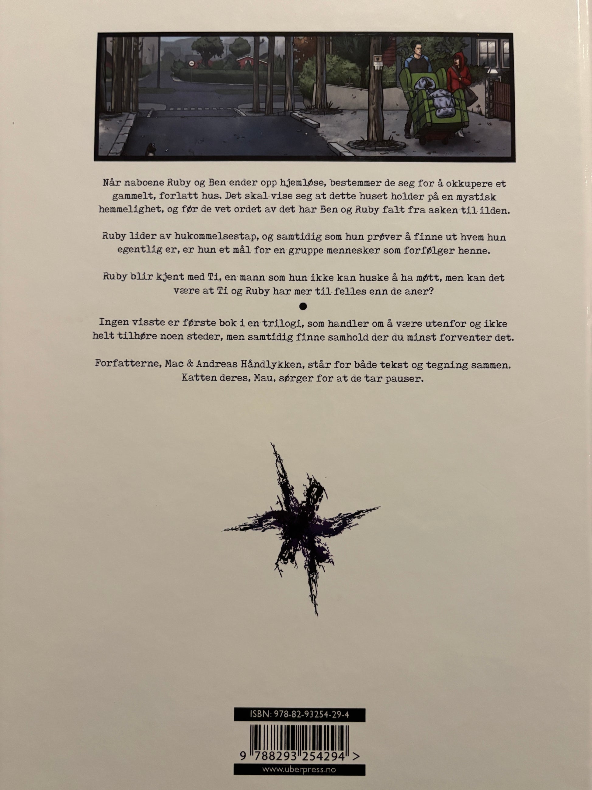 Nominert til Kulturdepartementet sin tegneseriepris 2019. Hva om du er redd for andre mennesker, hvem de er og hva de er ute etter? Du husker ikke hvem du er eller hva du gjør lenger? Hva om alt du er redd for virker litt for virkelig? Ruby og Ben har blitt hjemløse i Oslo og bestemmer seg for å okkupere et gammelt, forlatt hus. Et tilfeldig hus, tilsynelatende. Ruby husker ikke hvem hun er eller hvorfor en mann med navn Ståle leter etter henne. Ståle har kun et foto av Ruby sine besteforeldre til å identifisere henne med, for hun er prikk lik sin bestemor. Ben prøver å hjelpe henne så godt han kan, men han er egentlig ganske fornøyd med å ikke ha noen steder å høre hjemme. Livet kan han ta på sparket. Ti er en ung mann med hukommelsestap. Han har ingen minner fra sitt tidligere liv, noe som plager ham mye. Noe gnager såpass mye i ham at han aldri får ro. Ved en tilfeldighet treffes Ruby og Ti ... og de føler en plutselig lengsel, som om de har kjent hverandre i en evighet. Ståle overrasker dem begge også, ved å følge etter Ruby. Når han treffer Ti er han ikke bare overrasket, han er ekstatisk. Ruby og Ti har kanskje mer til felles enn de aner, men det er kanskje ikke en dør de vil åpne. Så Ståle åpner den for dem.