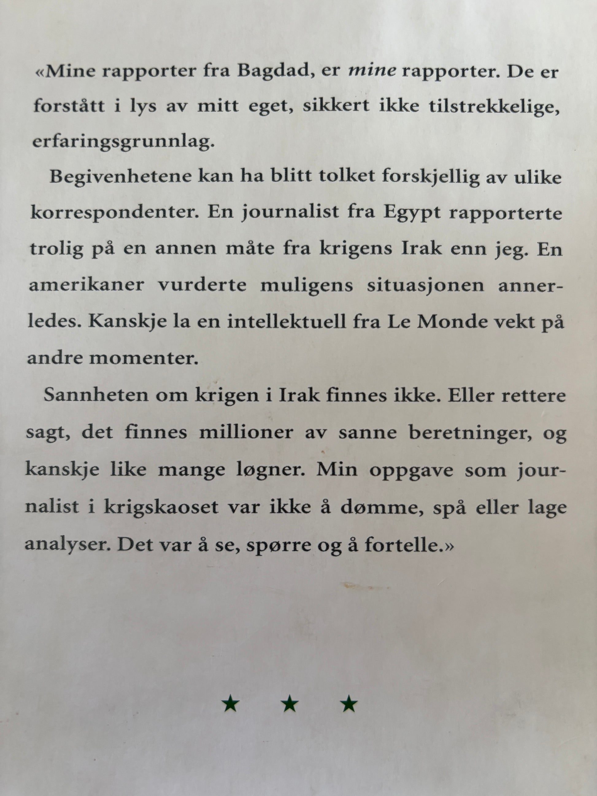 Mine rapporter fra Bagdad, er mine rapporter. De er forstått i lys av mitt eget, sikkert ikke tilstrekkelige, erfaringsgrunnlag. Begivenhetene kan ha blitt tolket forskjellig av ulike korrespondenter. En journalist fra Egypt rapporterte trolig på en annen måte fra krigens Irak enn jeg. En amerikaner vurderte muligens situasjonen annerledes. Kanskje la en intellektuell fra Le Monde vekt på andre momenter. Sannheten om krigen i Irak finnes ikke. Eller rettere sagt, det finnes millioner av sanne beretninger, og kanskje like mange løgner. Min oppgave som journalist i krigskaoset var ikke å dømme, spå eller lage analyser. Det var å se, å spørre og å fortelle. Fra januar til april 2003 - i hundre og én dag - arbeidet Åsne Seierstad som reporter i Bagdad for skandinaviske, tyske og nederlandske medier. I avisartiklene og TV-reportasjene hun laget, formidlet hun det som foregikk i Irak før, under og etter angrepet fra de amerikanske og britiske styrkene. Artiklene var øyeblikksrapporter, glimt fra krigen. De tilhørte bestemte dager og begivenheter. Vel så interessant fra reportasjereisen var det som skjedde mellom de avleverte artiklene, forarbeidet. Alt som ikke kom på trykk. Gjennom sine ti år som journalist i krigs- og konfliktsoner, har Åsne Seierstad aldri arbeidet under vanskeligere forhold enn i Irak. I denne boken gir hun et nært innblikk i de utfordringene hun møtte. Her gjengis noen eller deler av tekstene hun skrev under krigen, men de settes inn i en sammenheng, for å vise noe av hva jobben som krigskorrespondent består av.