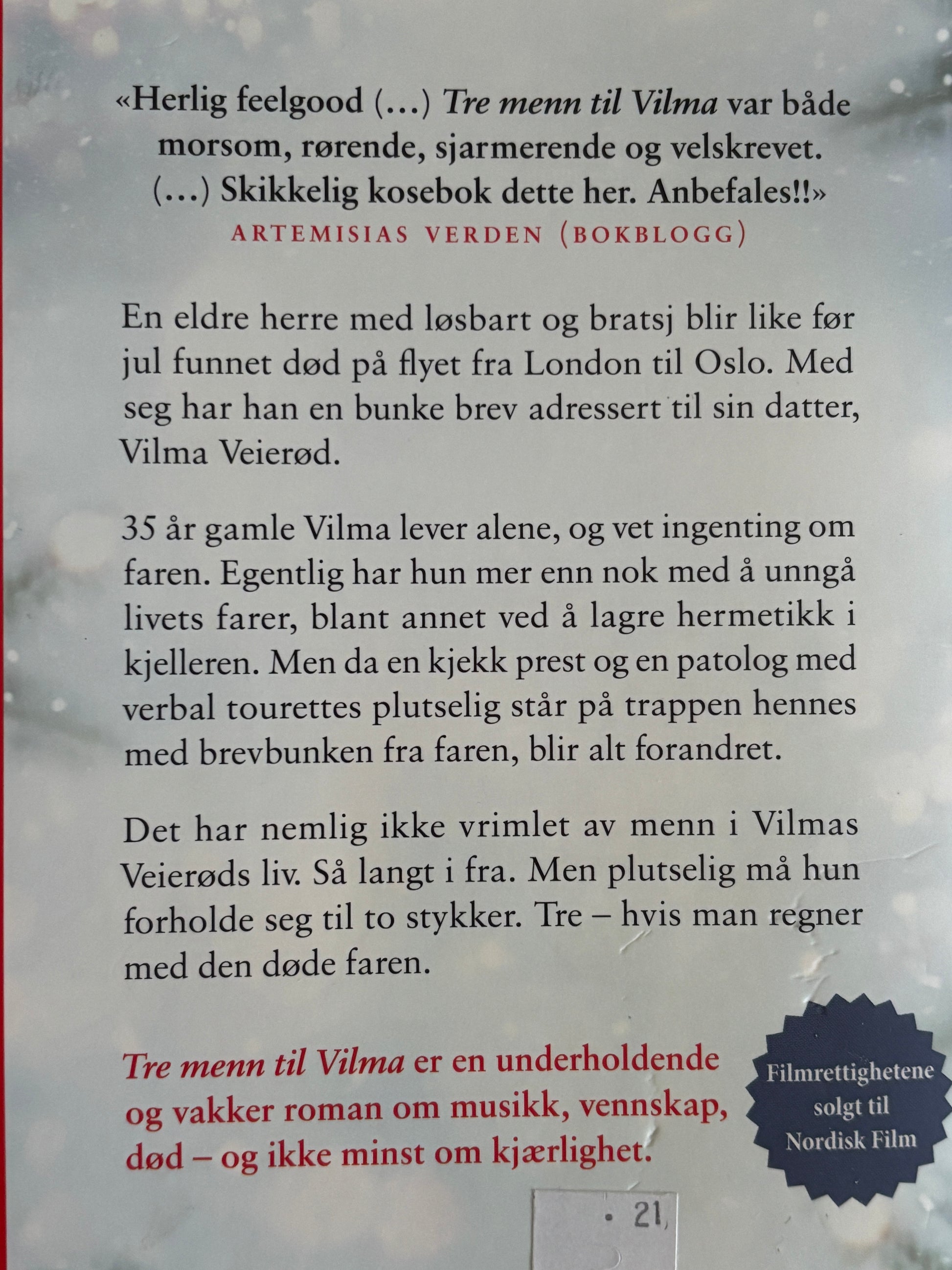 Det har nemlig ikke vrimlet av menn i Vilmas Veierøds liv. Så langt i fra. Men plutselig må hun forholde seg til to stykker. Tre - hvis man regner med den døde faren.