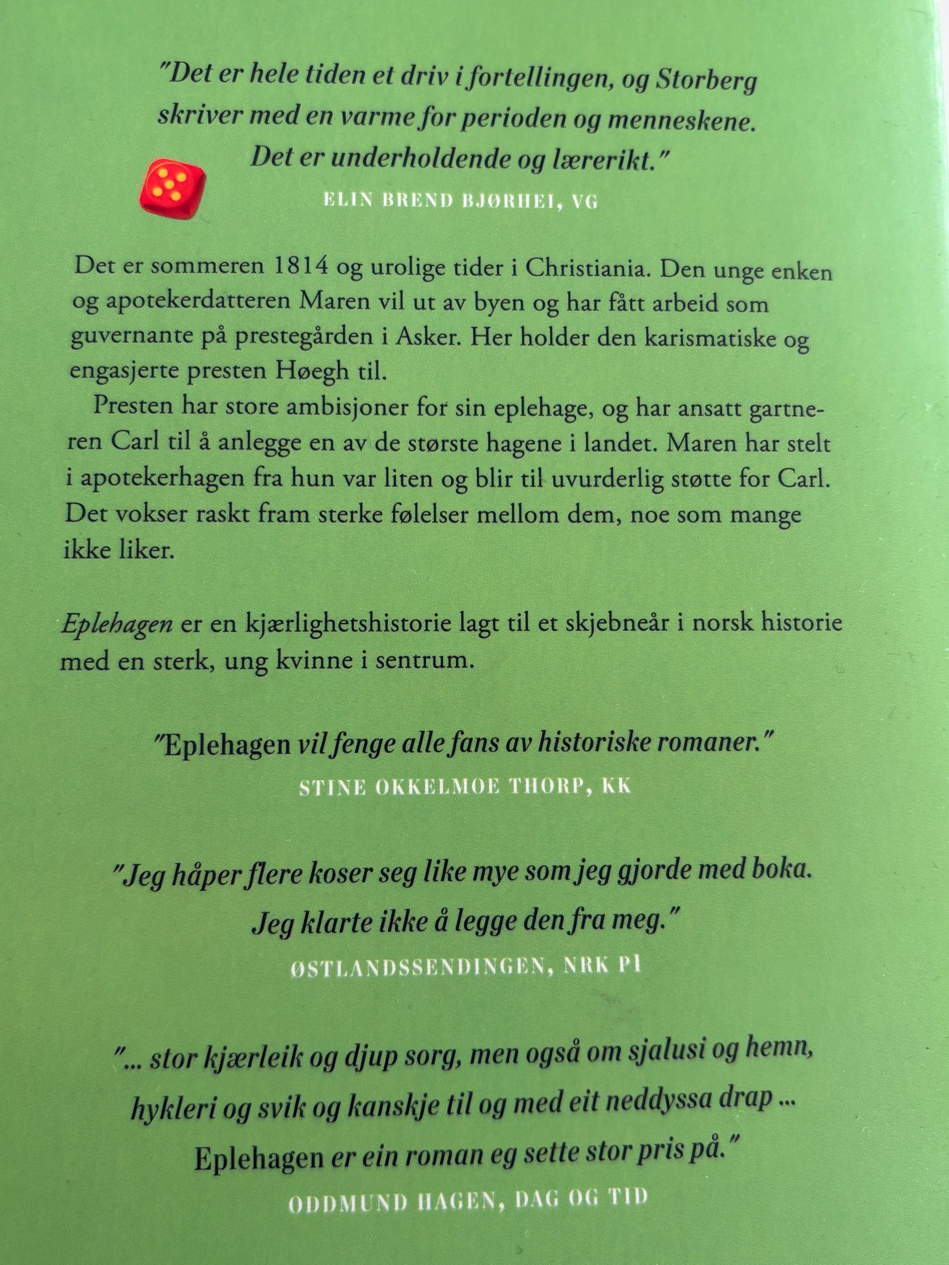EPLEHAGEN er en dannelsesroman lagt til et skjebneår i norsk historie med en sterk, ung kvinne i sentrum.